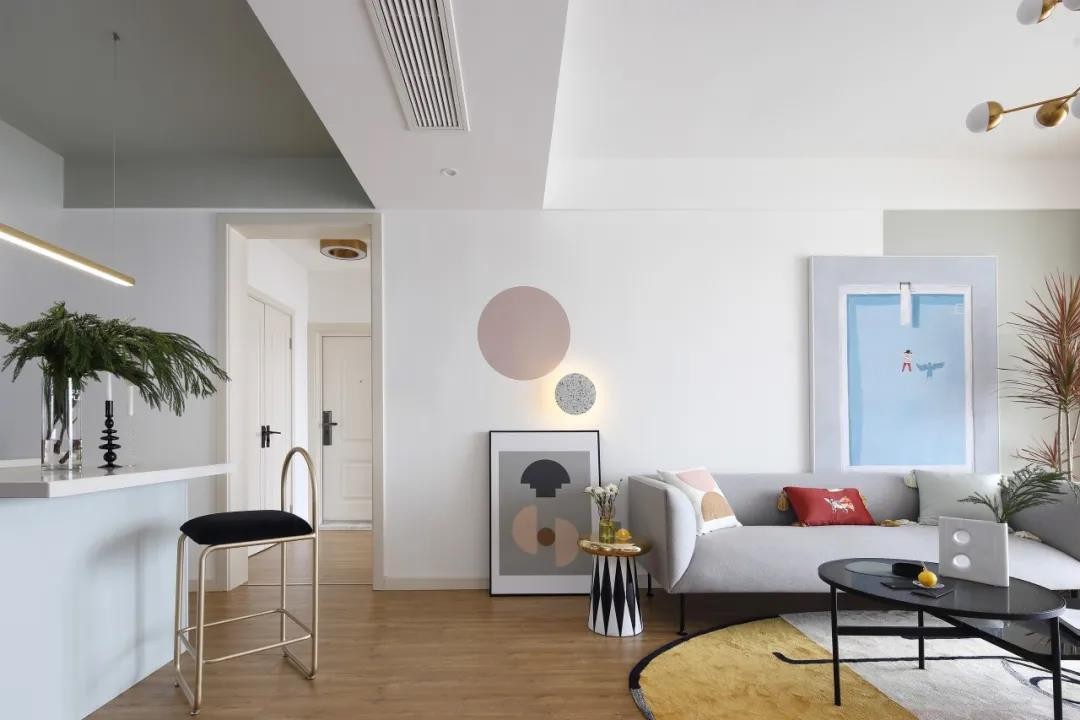 沙發(fā)墻潔凈的墻面加入白色與灰色的雙色設(shè)計(jì),掛放一幅極簡的掛畫,左側(cè)還有兩盞圓形的壁燈。灰色布藝沙發(fā),還有鮮艷活