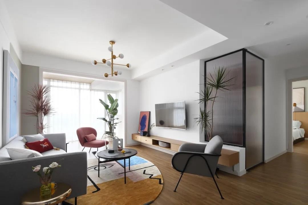 電視墻以懸空的木質(zhì)電視柜+壁掛電視機(jī),電視墻右邊加入長虹玻璃的室內(nèi)隔斷,讓空間的光線得以共享,同時(shí)也增加了空間的設(shè)計(jì)感。