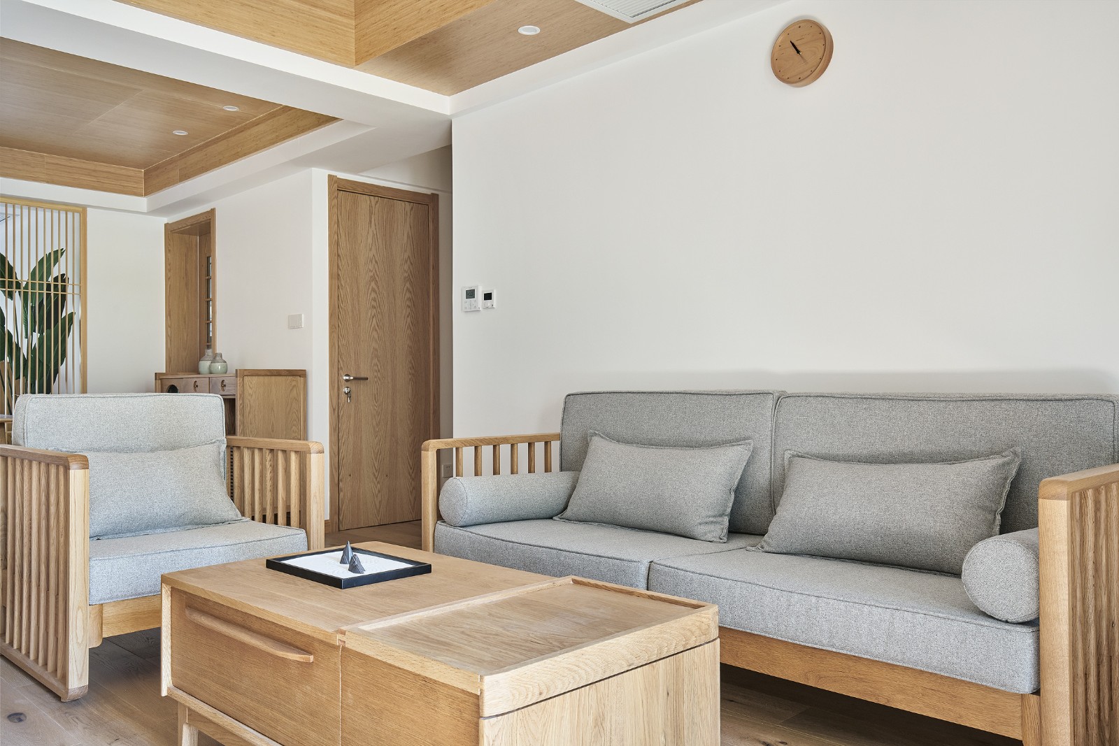 簡(jiǎn)單的灰色系布藝沙發(fā),端重卻不失靈動(dòng),自然的背景墻掛上實(shí)木小時(shí)鐘