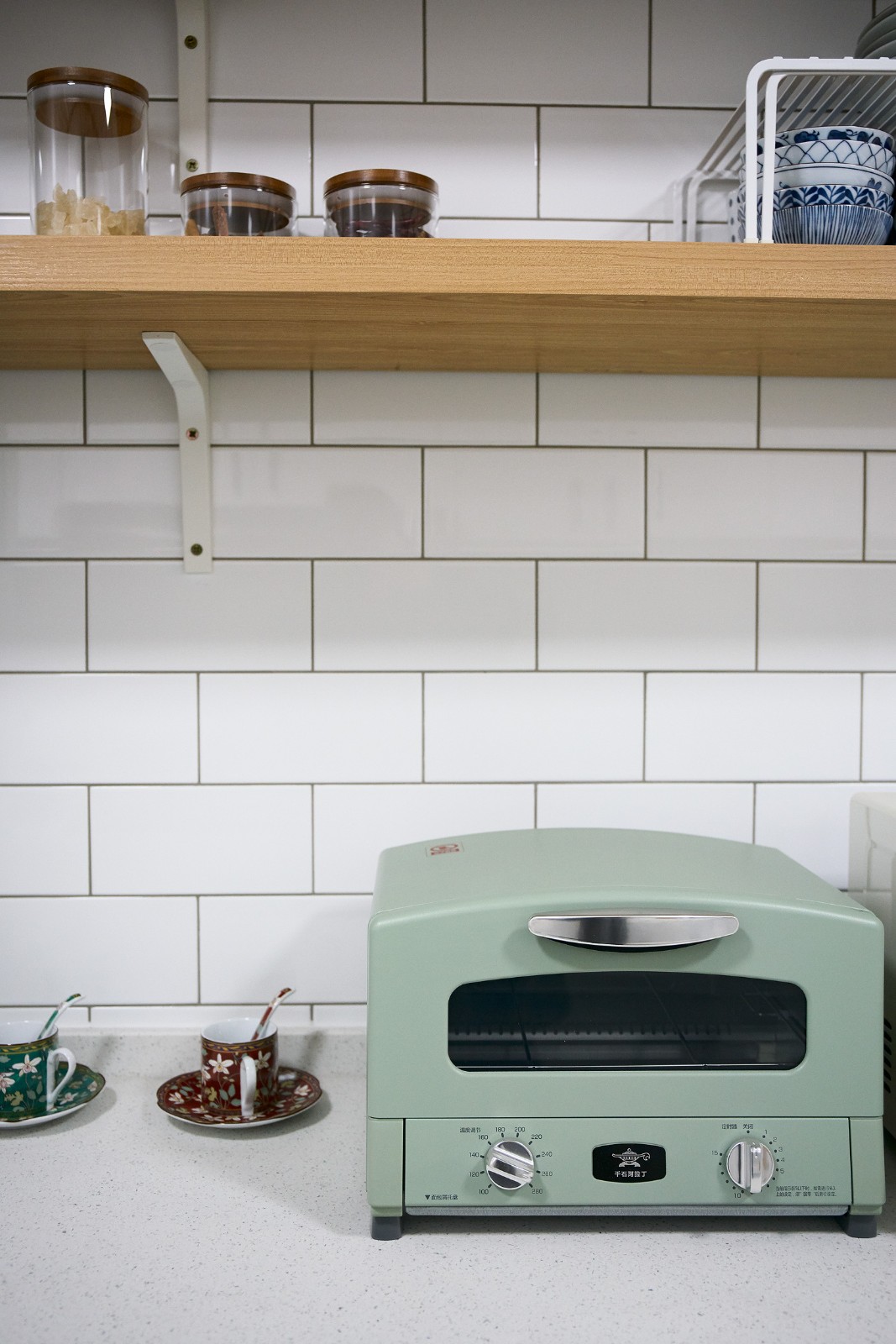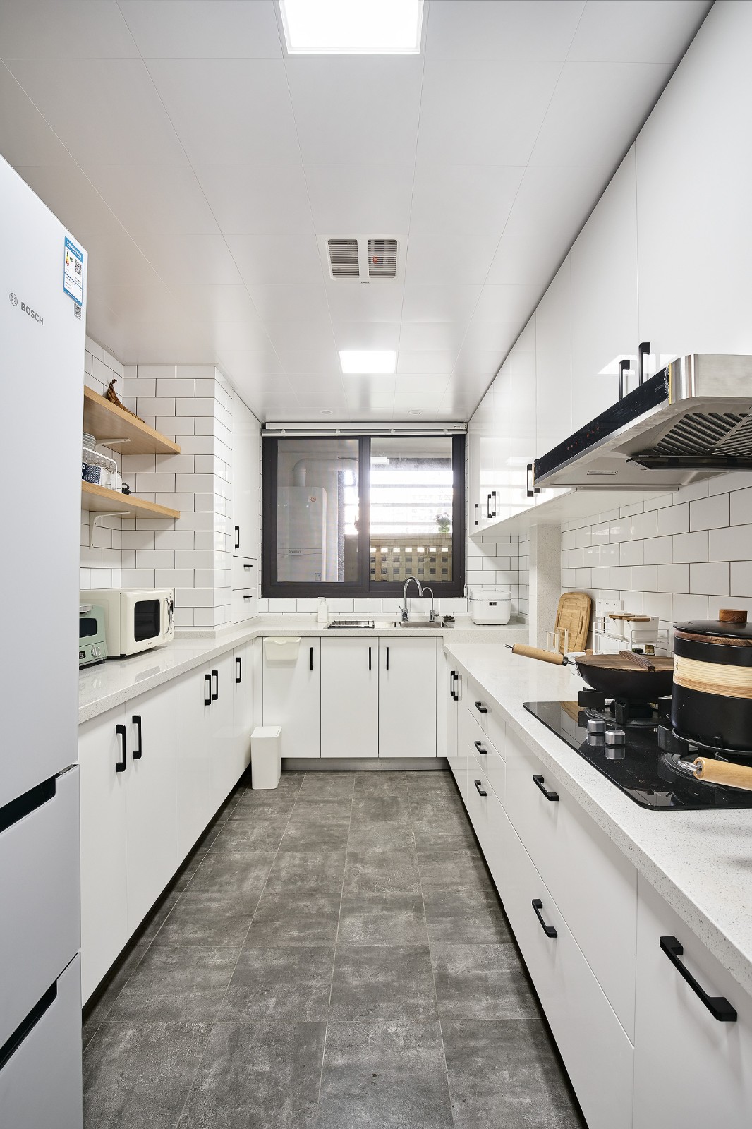 小白磚錯(cuò)落,黑色櫥柜把手十分精致。