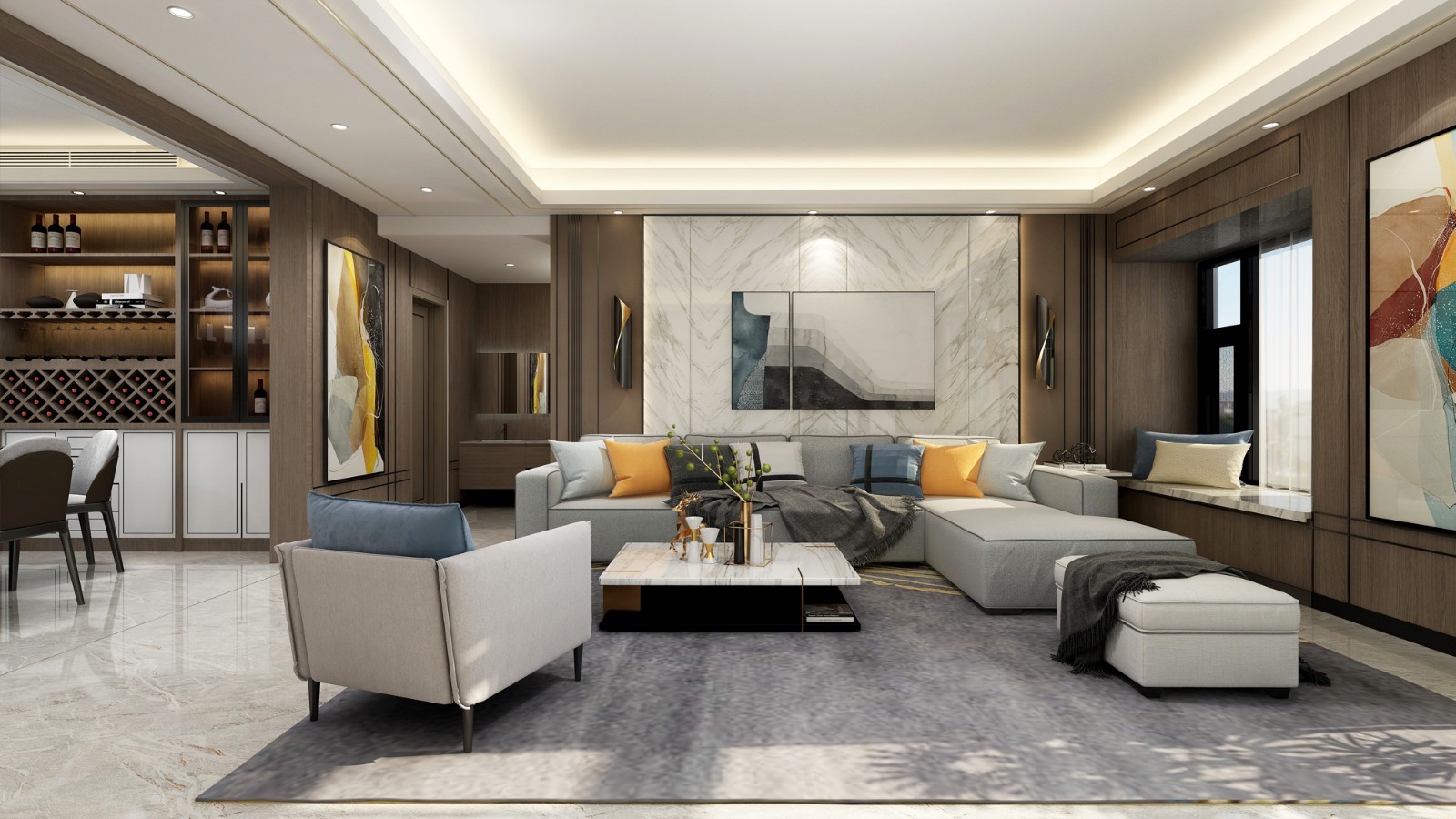 整個一樓客廳面積比較大,采用無主燈設(shè)計,巧妙地將燈光設(shè)計在吊頂之中,是一種低調(diào)的奢華。