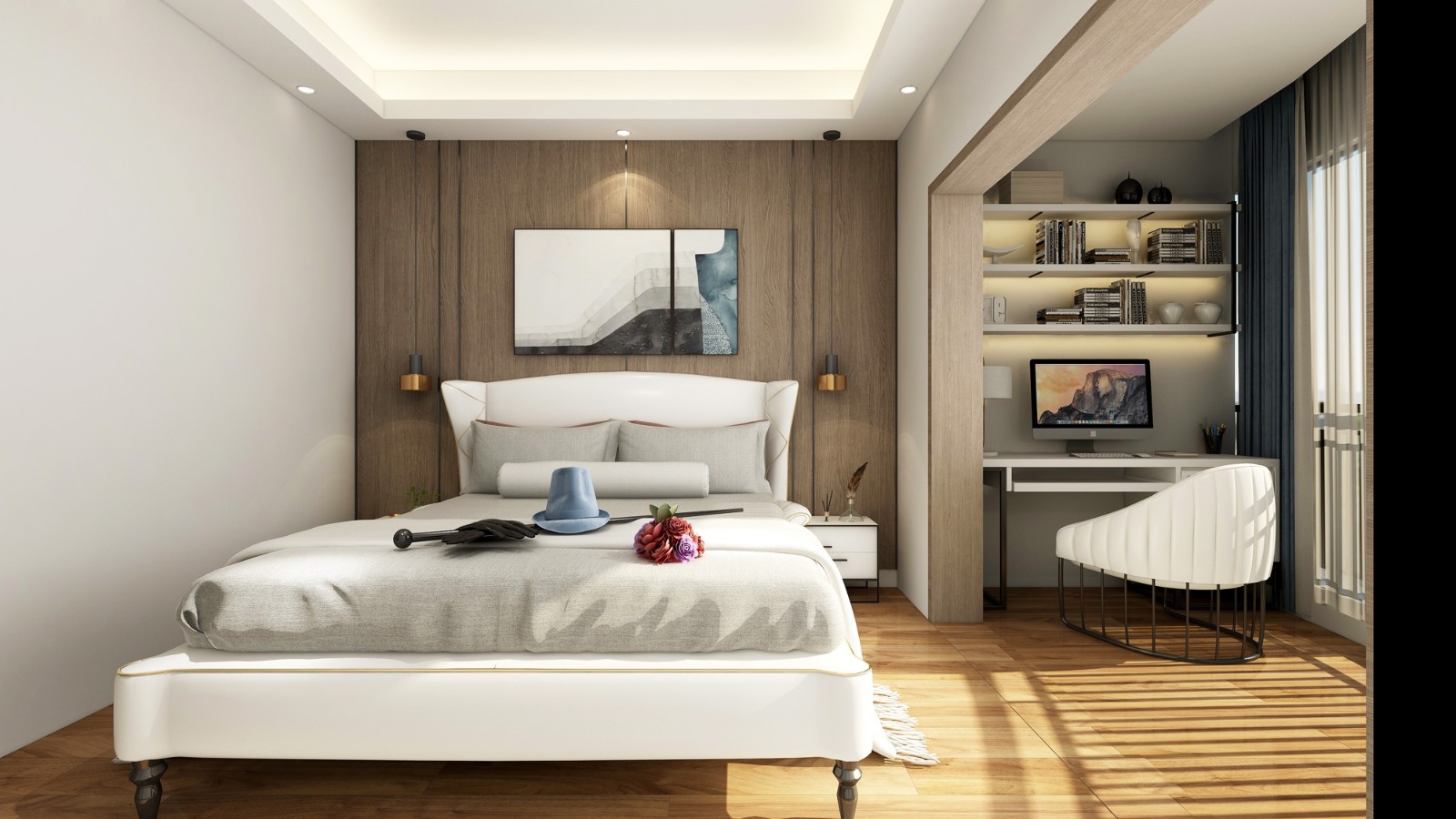 主臥將陽臺打通,在增大的室內(nèi)空間里打造出一個專屬的工作區(qū)。