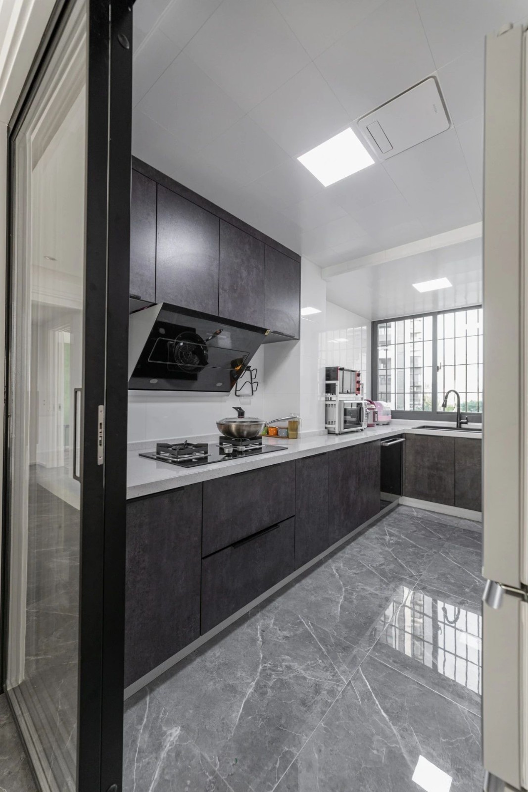 廚房的深色設計,仿佛沉淀了所有煙火氣,玻璃移門讓空間更加通透明亮,也能看到孩子在客廳的活動狀態(tài)。