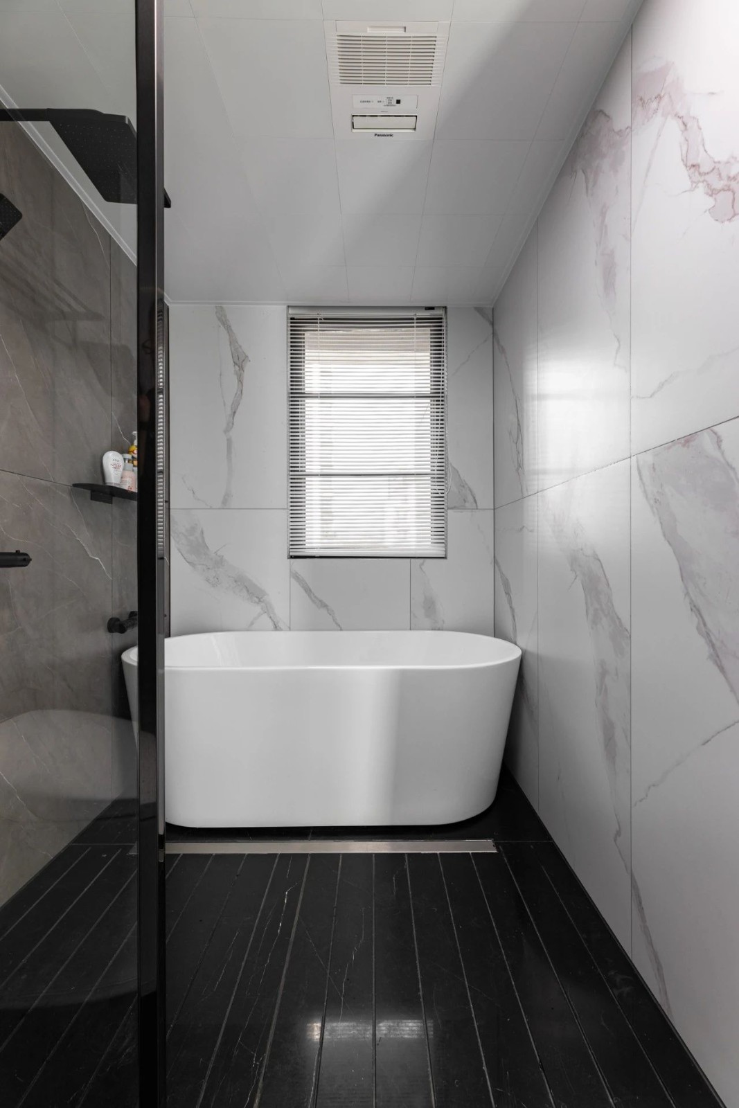 淋浴區(qū)地面做成石材拉槽設計,下水快又防滑,墻面的壁龕可放置洗浴用品,節(jié)省空間,拿取又方便。