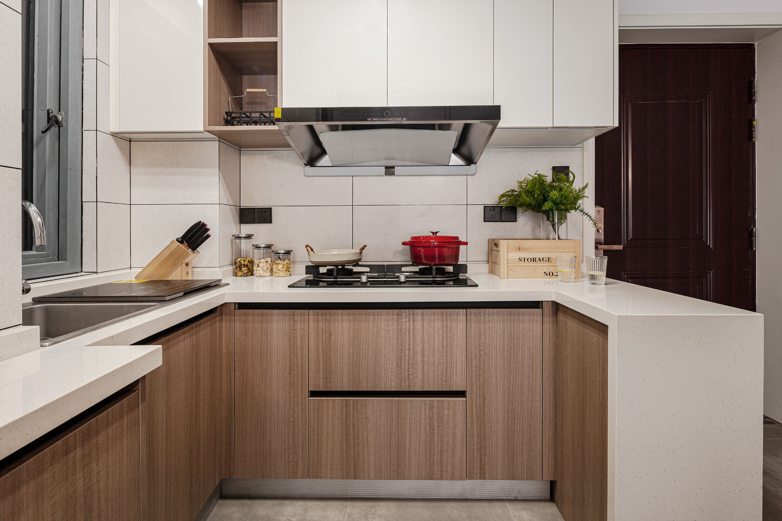 L型開放式廚房設計,充分利用轉(zhuǎn)角空間,合理布局。白色吊柜柜門+墻磚,搭配木紋櫥柜,色彩清爽簡約。