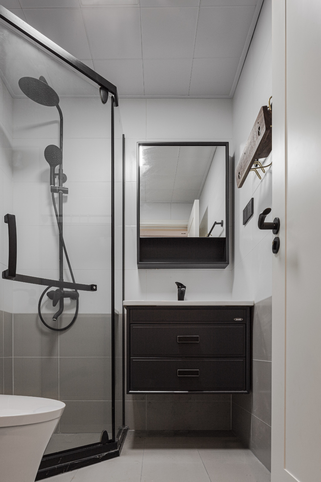 衛(wèi)生間簡約黑白灰掉,白色+灰色墻面腰線設計,深色簡約臺盆柜加深了空間層次感。