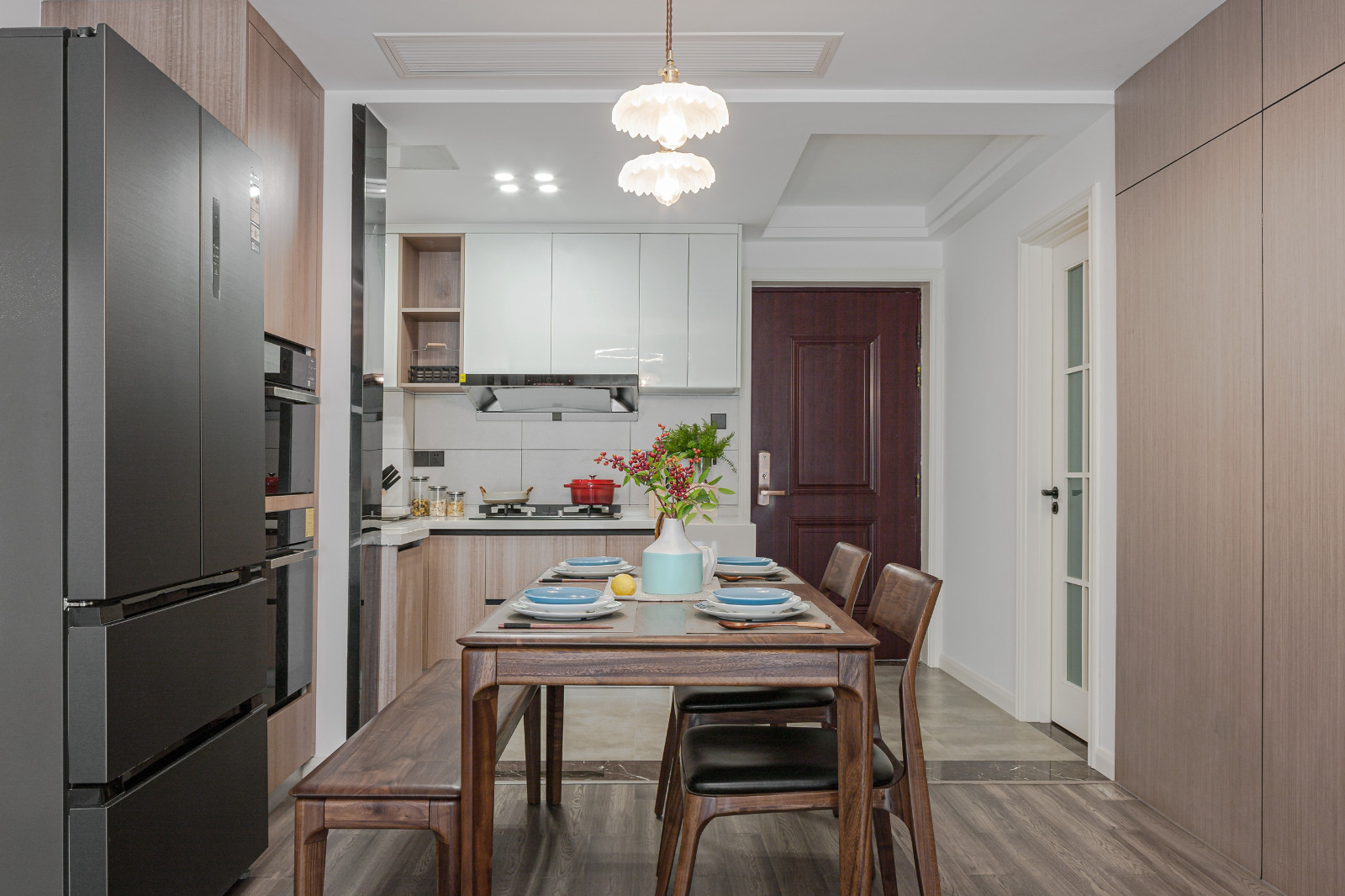 餐邊靠墻延伸廚房承重墻的厚度,做櫥柜高柜以及嵌入式冰箱,合理規(guī)劃空間,美觀實用。