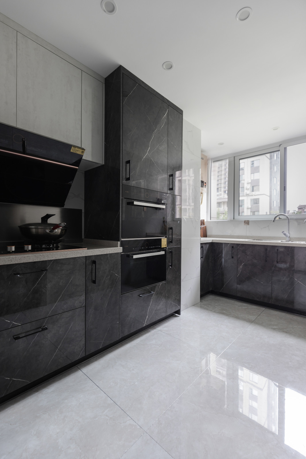 L型開(kāi)放式廚房設(shè)計(jì),充分利用轉(zhuǎn)角空間,合理布局。白色吊柜柜門+墻磚,搭配木紋櫥柜,色彩清爽簡(jiǎn)約。